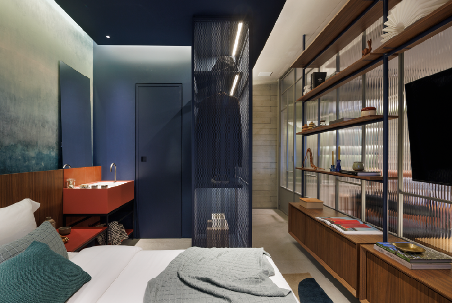 O studio de 45 m² surpreende pela sensação de amplitude. O layout aberto foi muito bem aproveitado, com soluções criativas e funcionais para definir os ambientes: uma estante divide sala e dormitório, incorporando uma mesa de trabalho. O canto alemão foi repaginado com mesa redonda e delimita a área de jantar, enquanto a bancada de quartzito azul escovado marca a transição entre cozinha e sala. O grid metálico no subteto também estará presente no Lobby Bar do Madá.