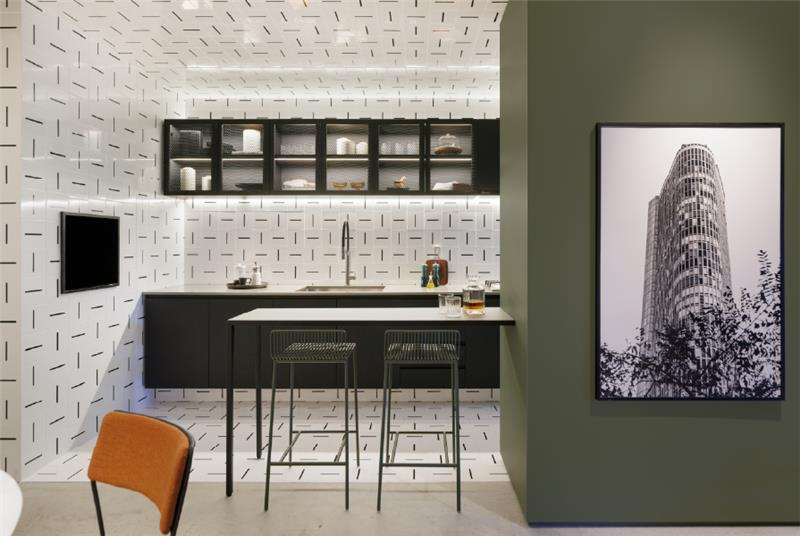 O revestimento estampado da cozinha é uma linha assinada pelo próprio Superlimão, que atua tanto na arquitetura quanto no design, para a Dalle Piagge.